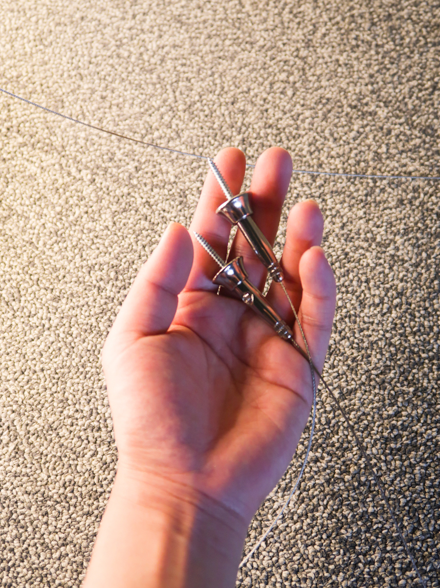 천정에 고정하실 만큼의 와이어 길이를 미리 표시해놓으시고요, 아래 맨 우측 사진처럼 동봉 해드린 링을 끼우신 후에 펜치를 이용해 꽈악 다물어 주세요. 남은 와이어는 펜치로 잘라주세요.